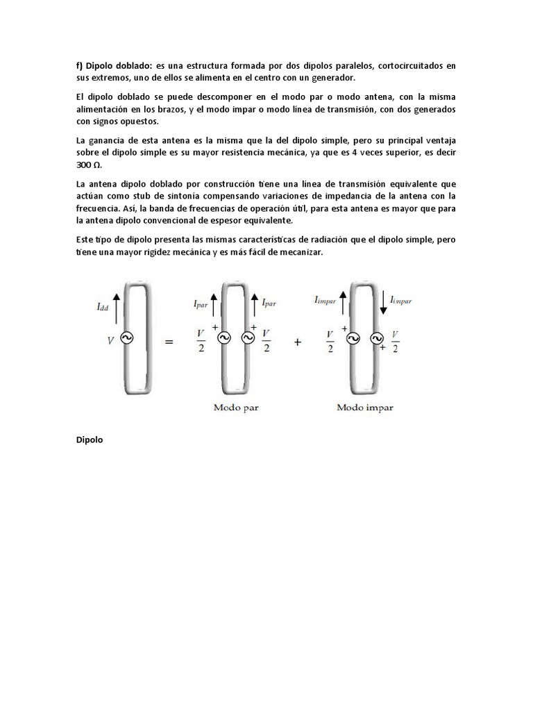 f) Dipolo doblado: es una estructura formada por dos dipolos paralelos, cortocircuitados en | Antena (Radio) | Electrónica